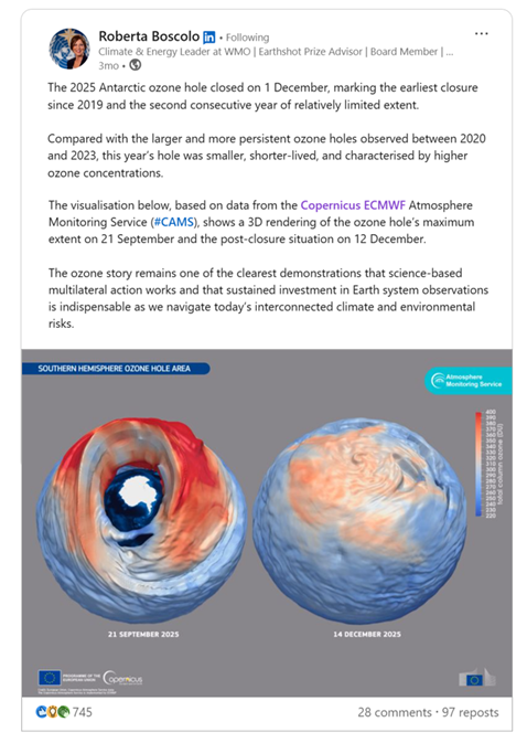 Images from Copernicus Image of the Day are used by international organisations such as the World Meteorological Organization (WMO) and their senior staff to support communication on environmental issues. This example shows a post featuring a CAMS-based visualisation of the Antarctic ozone hole. Credit: Roberta Boscolo, WMO (LinkedIn).